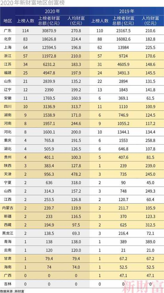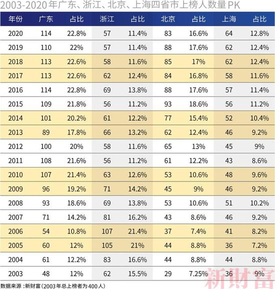 2020年新财富500富人榜,广东、北京、上海、浙江四省市继续领先,共计上榜318人,以全国3.2%的面积创造了63.6%的上榜富人。
