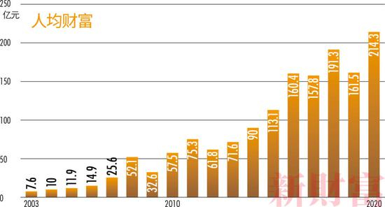 同为民营经济大省的浙江,共有57人上榜,人均财富210亿元,较2019年上升23.1%。