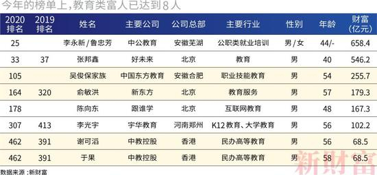 今年,教育类的上榜富人已多达8人。由于中公教育借壳上市,其控制人李永新、鲁忠芳母子二人今年首次上榜,财富即超过好未来的张邦鑫,成为教育首富。这也是教育行业首富第一次由国内资本市场制造。