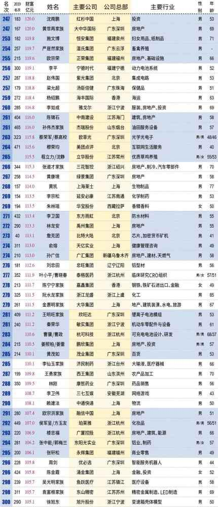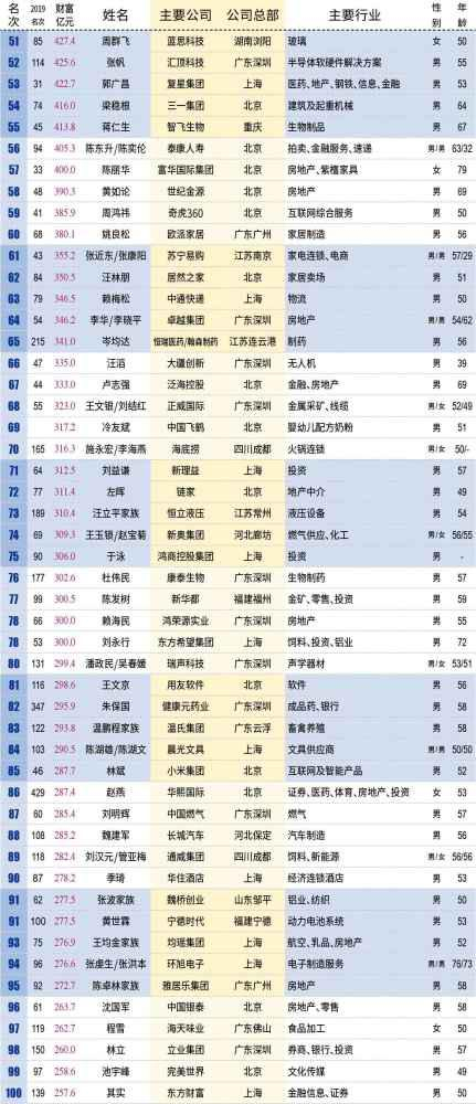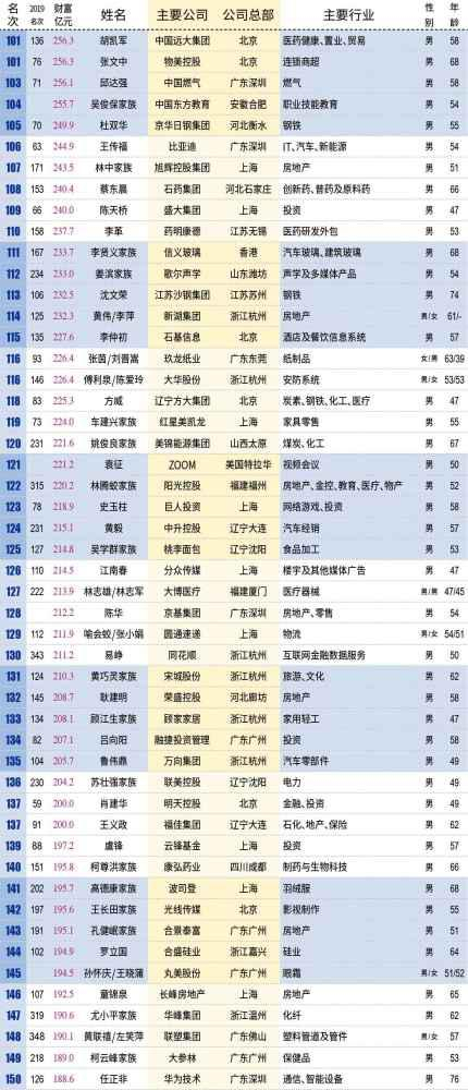 公职类考试培训机构中公教育创始人鲁忠芳、李永新母子今年首次上榜,便登顶安徽首富宝座。凭借A股IPO的东风,同样首次上榜的宝丰能源实控人党彦宝一举超越“锰王”贾天将,登顶宁夏首富,财富在总榜单上高居第36名,为2019年A股IPO的头号赢家。安踏体育的丁世忠兄弟超越达利食品的许世辉家族,成为福建首富。