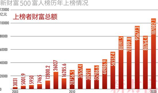 2020年的榜单数据,一改去年的低迷。新财富500富人的总财富首次突破10万亿元大关,再创历史新高。人均财富首次超过200亿元,达到214.3亿元。而上榜门槛在去年大跌至45亿元之后,回升至63.3亿元,与2016-2018年持平,完美收复失地。
