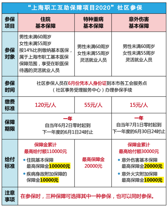 据上海发布,上海灵活就业人员和退休职工看过来~市总工会说,“上海职工互助保障项目2020”社区参保基本保障以及“退休职工住院补充医疗互助保障计划”2020社区参保,将于6月1日开启。