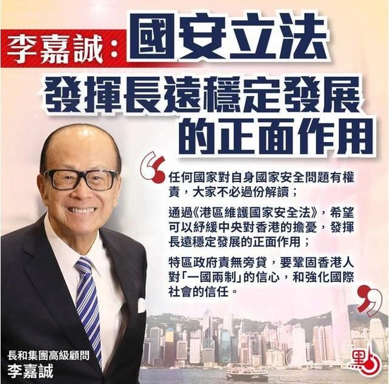 今天,李嘉诚对此进行表态称:“‘港版国安法’可以纾缓中央对香港的担忧,发挥使香港长远稳定发展的正面作用。”