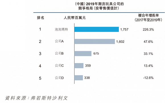 沙利文报告显示,2019年,按零售价值计,前五大品牌分別占中国潮玩零售市场份额的8.5%、7.7%、3.3%、1.7%及1.6%。