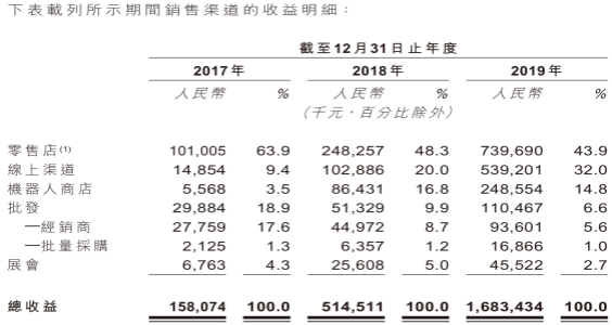 截至2019年12月31日,泡泡玛特在中国拥有825间机器人商店(自动售货机),其中81间机器人商店由合作伙伴负责运营,每月拿出总銷售收益的35%进行分成。但是,招股书显示,机器人商店近年来贡献的收益占比逐渐在减少,从2018年的16.8%下降至2019年的14.8%。