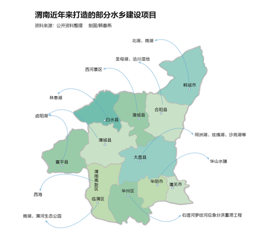 “秦东水乡”计划从2016年开始,很快在渭南全市铺开。多个造湖造景项目,在2016~2017年纷纷上马,几乎覆盖所有县(市、区)。2017年8月30日,渭南市政府官方称,水利建设继续保持了高位投入的良好态势,共争取中省水利资金58.5亿元,位列全省10地市之首,完成水利投资超过90亿元。