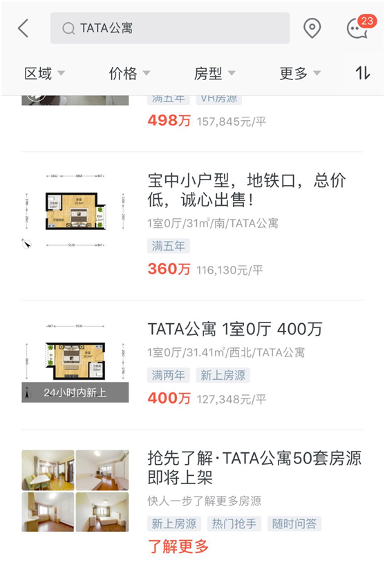 TATA公寓就是其中之一。链家APP的数据显示,TATA公寓房源下架前的挂牌价在每平方米8万至15万元之间。而去年6月,面积在30平方米左右的TATA公寓房源,成交均价仅在每平方米7万元左右。
