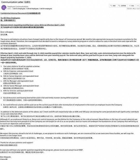 邮件称,管理层商议决定推行临时性员工薪酬缓发计划,为公司减少短期固定成本支出,各层级员工4月、5月、6月及7月薪资按不同比例缓发,延期发放的部分将于9月7日前,随8月份工资一次性支付。