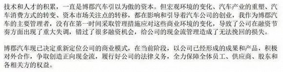 信中黄希鸣坦言,其作为博郡汽车领导者,没能关注宏观环境、行业、市场的变化,错失很多融资机会,最终导致公司面临“资金荒”。