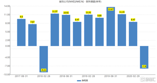 6月26日,耐克发布2020财年第四季度业绩(期限为3-5月),报告期恰逢欧美疫情高峰期,耐克实现营业收入374.03亿美元,同比下降4%。截至5月底的2020财年第四财季,耐克营业收入达63.13亿美元,低于预期的73.8亿美元,同比下降38.14%,季度净亏损7.9亿美元(超50亿人民币),同比下179.88%,这对于耐克而言,这是一次罕见的失误——在过去8年中该公司仅2次未达到盈利预期。
