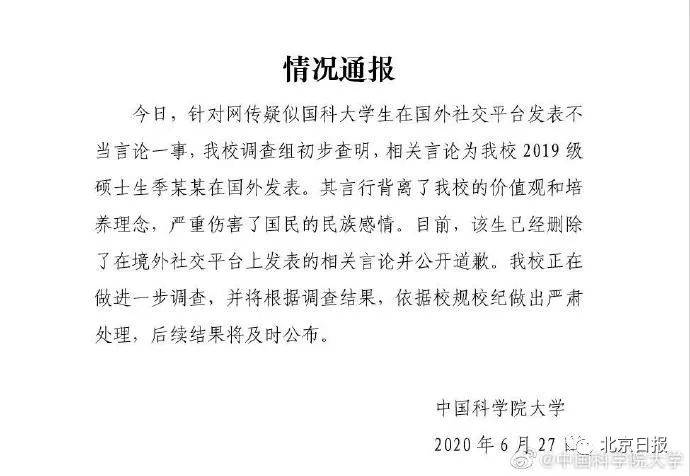 6月27日晚9时30分许,@中国科学院大学通报称,今日,针对网传疑似国科大学生在国外社交平台发表不当言论一事,我校调查组初步查明,相关言论为我校2019级硕士生季某某在国外发表。其言行背离了我校的价值观和培养理念,严重伤害了国民的民族感情。目前,该生已经删除了在境外社交平台上发表的相关言论并公开道歉。