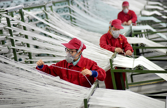 2020年3月25日,工人在山东省淄博市一家节能材料企业车间忙碌。