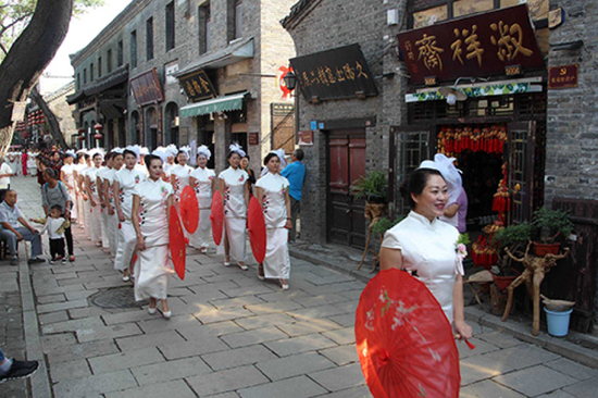 山东省淄博市周村区,旗袍爱好者在古城丝绸文化街走秀。