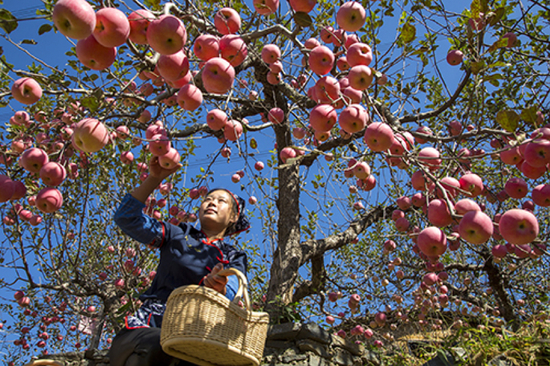 山东省沂源县张家坡镇西瓜峪村村民采摘苹果。