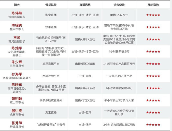 除开农户们自己主导的直播外,这几个月里盛行起来了由县市级领导加入的直播带货,成绩斐然受到广泛关注。下表节选自网络资料,介绍当下最火热的县长直播成绩。