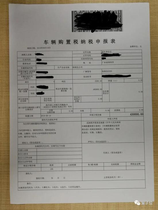 他买的Model 3,售价43万,还要交4.3万的购置税。