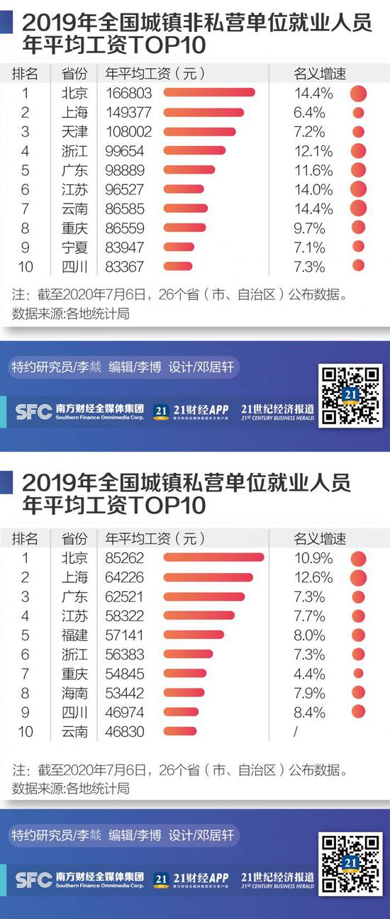 其中,在城镇非私营单位中,北京、上海、天津年均工资最高,2019年均在10万元以上;在城镇私营单位中,居前三的则是北京、上海、广东,2019年年均工资均在6.2万元以上。