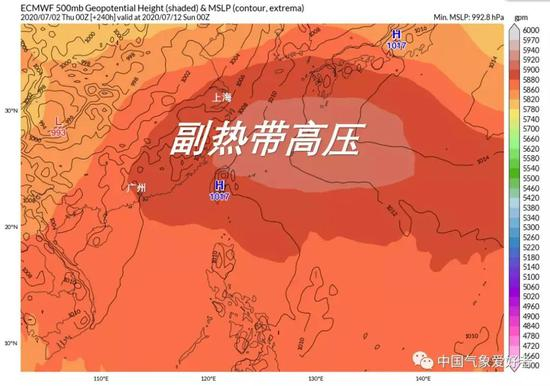 ECWMF数据预估7月12日副热带高压位置,作图:中国气象爱好者