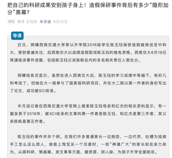 6月22日,新华社半月谈发表了名为《把自己的科研成果安到孩子身上!造假保研事件背后有多少“隐形加分”黑幕?》的评论文章。在文章中,作者写道: