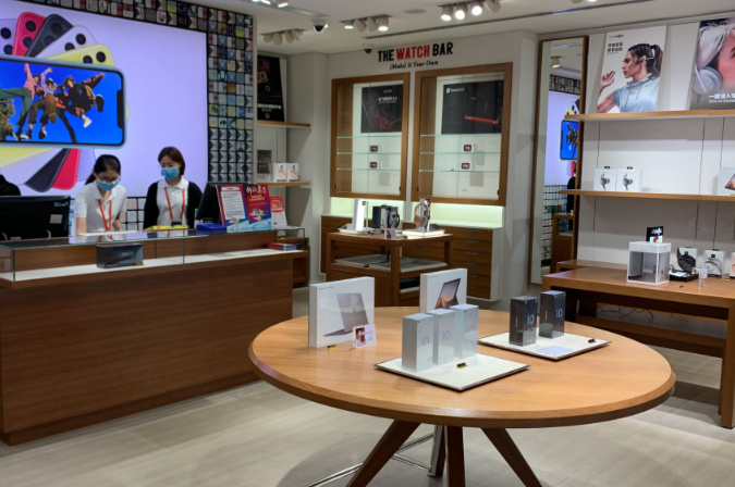 这是7月16日,第一财经记者在美兰机场采访时看到的一幕。该店主要销售苹果、华为、小米等电子商品,有趣的是,原本摆放苹果手机的位置已被小米和华为手机所替代。