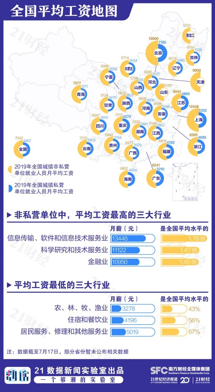 城镇非私营单位中,有7省超过全国平均水平(月入7542元),依次是北京(13900元)、上海(12448元)、天津(9000元)、浙江(8305元)、广东(8241元)、江苏(8044元)、青海(7577元);