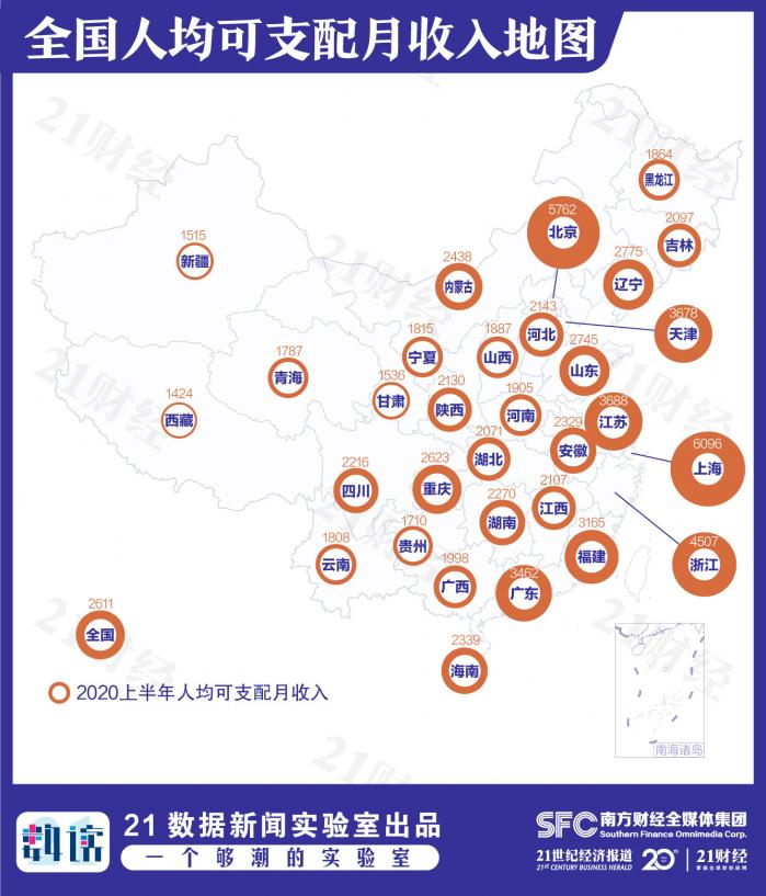 上海以人均可支配月收入6096元继续领跑,北京则以5762元紧随其后。