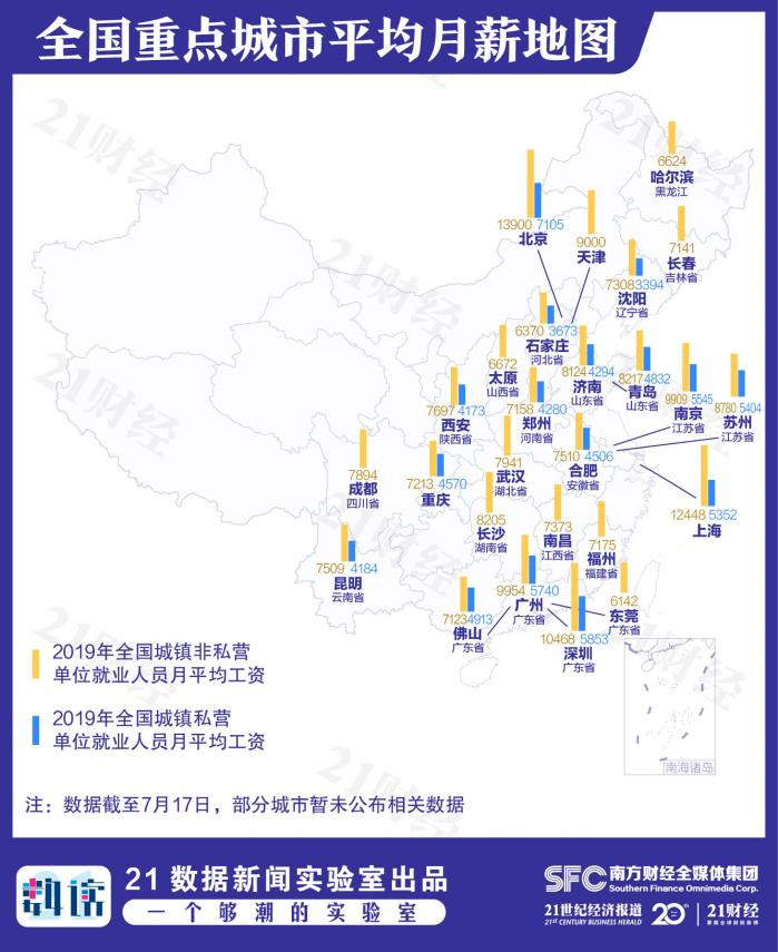 城镇私营单位中,有10城平均月薪超过全国平均水平(4467元),分别是北京、深圳、广州、南京、苏州、上海、佛山、青岛、重庆、合肥。