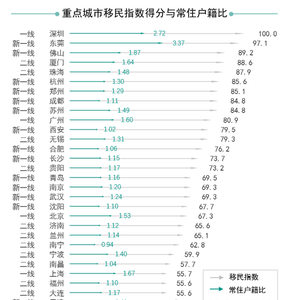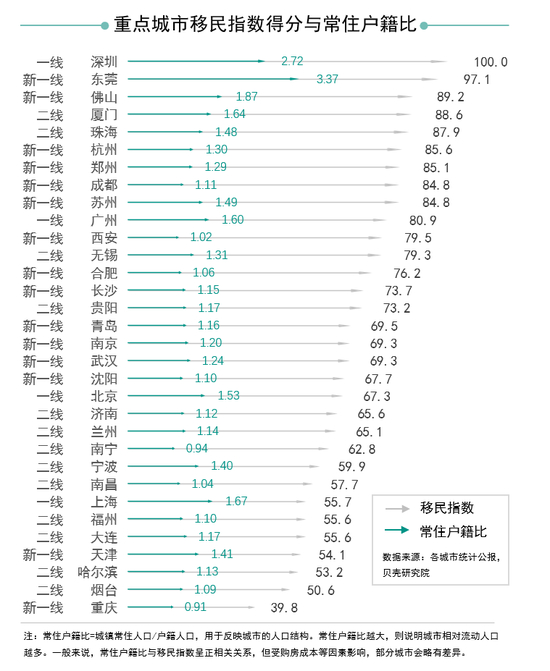 贝壳研究院发布的城市移民指数报告显示,分城市看,深圳、东莞、厦门的移民指数分别居一线、新一线、二线城市首位。