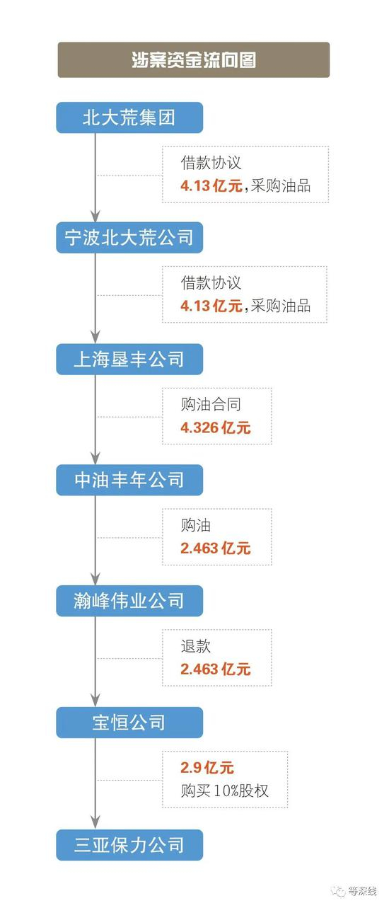 上海垦丰公司与马彬控制的中油丰年签订了委托购油合同,后者按照合同获得了4.326亿元资金并完成了20多万吨的油品采购和交付。资金明细显示,其中有一笔2.463亿元的退款被另外一家公司退到了宝恒公司,该公司就是马彬参与三亚土地收购、支付2.9亿元收购款的公司。