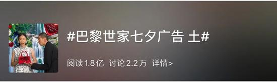 8月11日, #巴黎世家七夕广告 土#的tag话题登上了微博热搜,一天之内关注度持续上升,话题阅读量达到1.8亿。