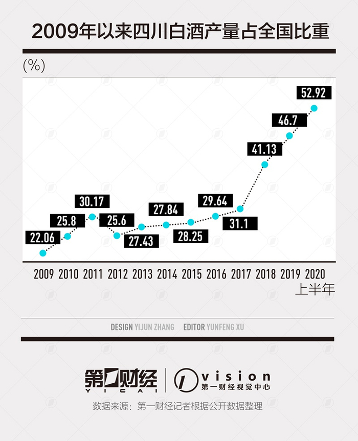 今年上半年,四川白酒实现历史性地跨越,在全国白酒产量的占比首次超过了50%,也就是说,全国每两瓶酒中有一瓶来自四川。