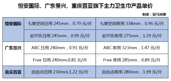 据斑马消费数据显示,恒安国际(七度空间、安尔乐)、广东景兴(ABC、FREE)、重庆百亚(自由点)等企业旗下卫生巾在天猫超市、京东超市等电商平台的售价,单片价格均不超过2元/片。
