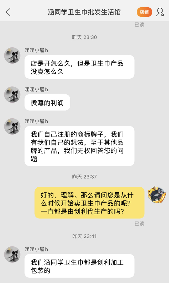 时代周报新媒体记者通过淘宝联系到店铺“涵同学卫生巾批发生活馆”(以下简称“涵同学”)的工作人员,询问产品的质量问题,得到的回复是:“涵同学卫生巾都是由创利加工包装的,产品质量都是经过检验得到的检验报告。”