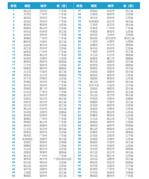 白皮书的研究对象为,截至2020年6月30日(根据民政部县以上行政区划变更),除直辖市市辖区和港澳台地区外的其他898个市辖区。从排名来看,深圳南山区、广州天河区、深圳福田区、深圳龙岗区、青岛黄岛区、佛山顺德区、杭州余杭区、深圳宝安区、广州黄埔区、宁波鄞州区位列前10名。