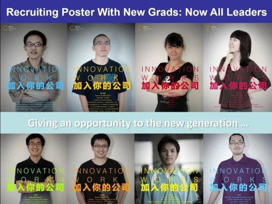 这张图是创新工场成立第一年的校招海报,上面写着“加入你的公司”。我们的目标是让年轻人以工程师的身份进入创新工场,通过技术创新得到资金支持,成为下一个成功公司的CEO。