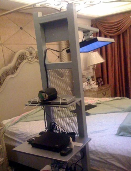 上面这张图片是2000年拍的,那时我刚做完一个手术,不能下床,于是让团队帮我做了这样一个架子,我可以躺在床上继续看电脑和工作。