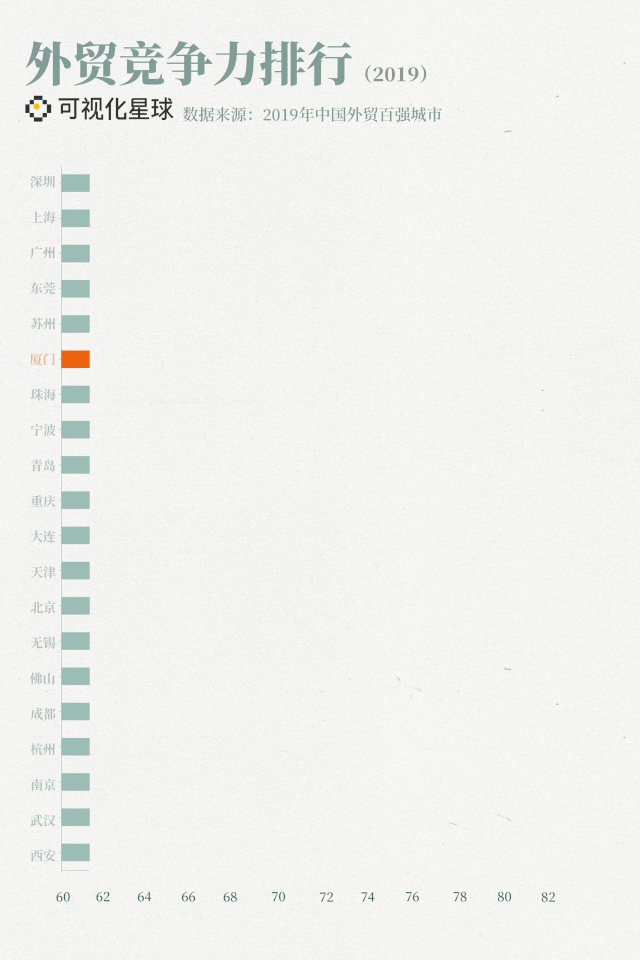 厦门充分发挥自己的区位优势,外贸进出口规模占福建省半壁江山,在全国的外贸竞争力排行中也名列前茅。