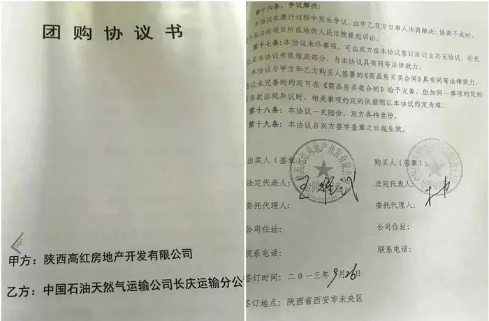 西安长庆运输公司属于全国最大央企之一中石油的下属子公司,2013年9月26日,时任中石油长庆运输公司的总经理杨强与高红地产负责人王耀武签署了“贞观首府”团购协议。