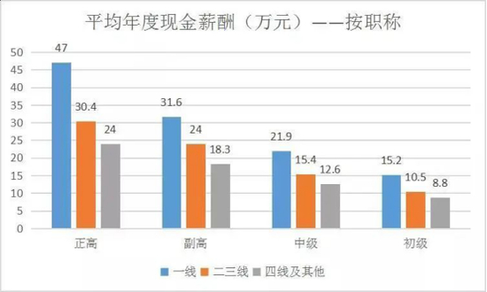 根据丁香人才发布的《2020中国医院薪酬调研报告》,2019年医院平均薪酬为18.5万元。从地域看,一线城市平均薪酬25.3万元,二三线城市为19万元;从职称看,初级、中级、副高、正高职称的平均薪酬分别为11万元、16万元、24.2万元、32.4万元。
