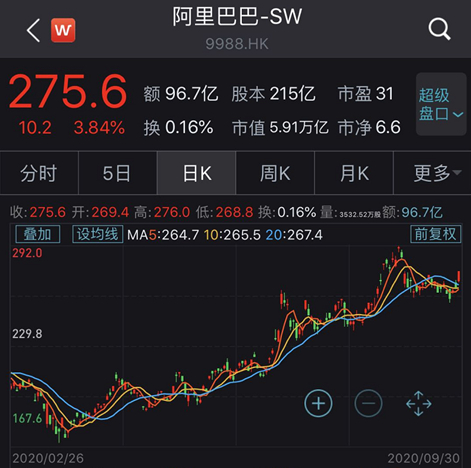 美股方面,自去年9月10日张勇接任以来,2020年9月13至2020年9月30日,阿里美股股价在56周中实现66%的涨幅,股价也由170美元左右飙升至290美元,截止昨夜美股收盘,报收293.38美元/股,最新总市值为7887亿美元(约合5.36万亿元人民币)。