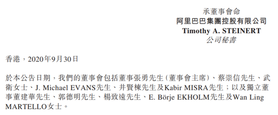 公告还称,于本公告日期,我们的董事会包括董事张勇(董事会主席)、蔡崇信、武卫、J. Michael EVANS、井贤栋及Kabir MISRA先生;以及独立董事董建华、郭德明、杨致远、E. Börje EKHOLM及Wan Ling MARTELLO。