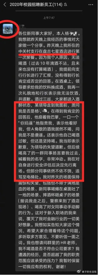 当时的酒局让他害怕和震惊:满地是血的场景,新同事喝得不省人事吐了一地,摔碎酒杯砸桌子,趁着喝醉对女同事动手动脚.....