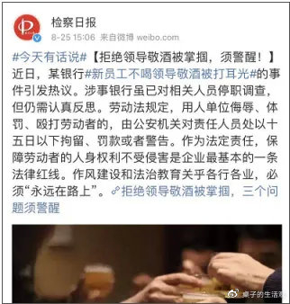 检查日报发微博支持该员工:拒绝领导敬酒被掌掴,违法劳动法,可以提出拘留。