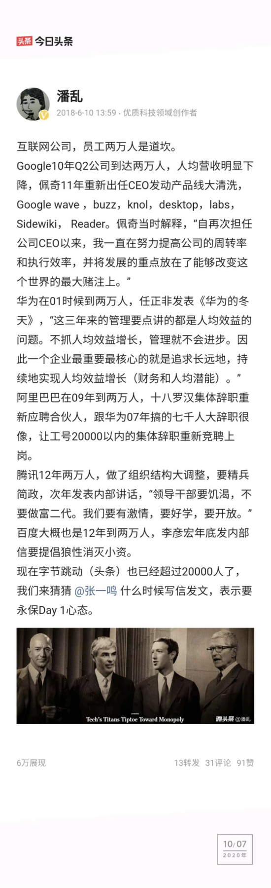互联网公司员工到两万人后,常见动作是CEO写信发文,整肃管理团队,在公司搞整风运动。