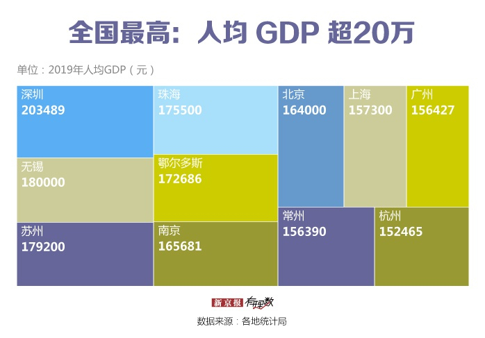 2019 年,全国有 11 个城市人均 GDP 超过 15 万元,其中人均 GDP 最高的就是深圳,2019 年人均 GDP 在 20 万元以上,远高于其他一线城市。