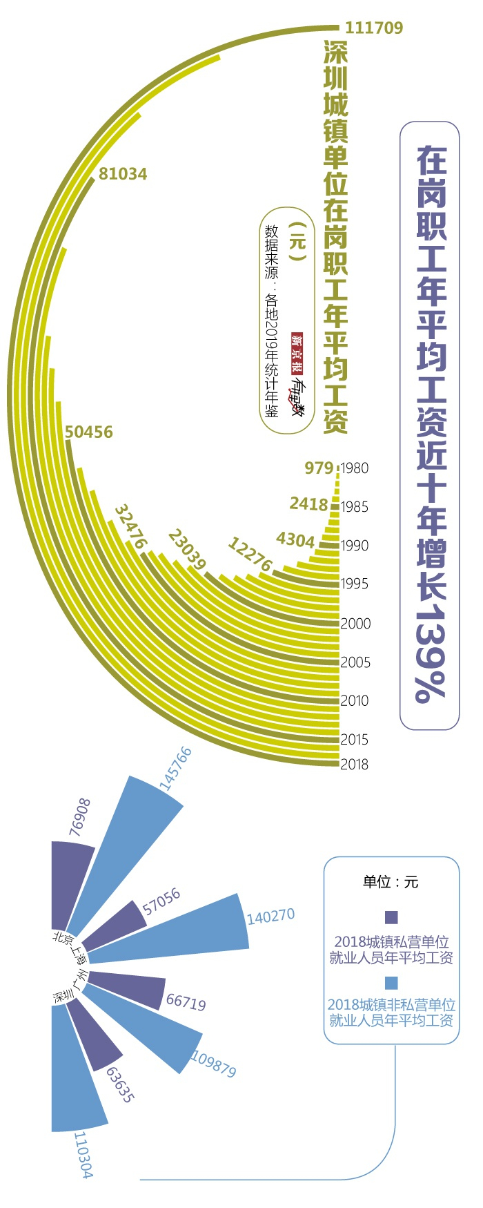首先,是高薪的驱动。1982 年,深圳全面试点工资改革,在内地率先实行结构工资制,从此,“基本工资+绩效奖金”的薪酬模式逐渐传遍全国。1980 年,深圳城镇单位在岗职工年平均工资仅为 979 元;1994 年,这一数值便成功破万;2018 年,深圳城镇单位在岗职工年平均工资达到 111709 元,远超全国平均水平。