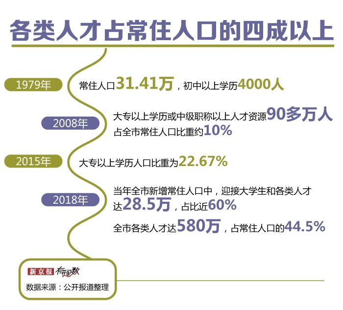 据报道,1979 年,深圳 31.41 万常住人口中,仅有 4000 人是初中以上学历;到 2008 年底,深圳大专以上学历或中级职称以上人才资源(含技师、高级技师)总量增加到 90 多万人,占全市常住人口比重上升至 10%。