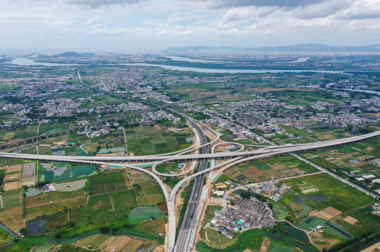 这是已经建设完成的潮汕环线高速公路上北互通立交,沈海高速公路从该互通立交下面穿过。无人机照片 新华社记者 刘大伟 摄