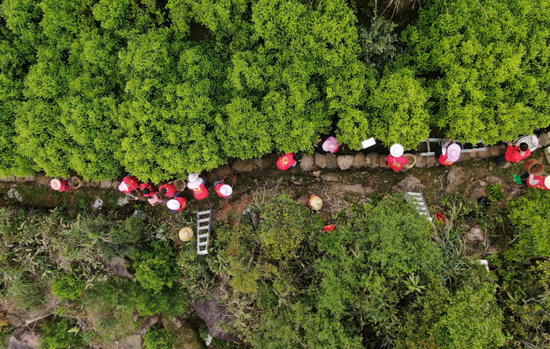 广东省潮州市潮安区凤凰镇山上,采茶工在采茶。无人机照片 新华社记者 邓华 摄
