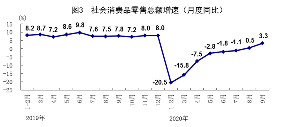前三季度,社会消费品零售总额273324亿元,同比下降7.2%,降幅比上半年收窄4.2个百分点;其中三季度增长0.9%,季度增速年内首次转正。9月份,社会消费品零售总额35295亿元,同比增长3.3%,增速比8月份加快2.8个百分点,连续2个月增长。前三季度,按经营单位所在地分,城镇消费品零售额236843亿元,下降7.3%;乡村消费品零售额36481亿元,下降6.7%。按消费类型分,餐饮收入25226亿元,下降23.9%;商品零售248098亿元,下降5.1%。消费升级类商品销售较快增长,通讯器材类、体育娱乐用品类、化妆品类商品零售额分别增长7.2%6.8%4.5%。前三季度全国网上零售额80065亿元,同比增长9.7%,增速比上半年加快2.4个百分点。其中,实物商品网上零售额66477亿元,增长15.3%,占社会消费品零售总额的比重为24.3%